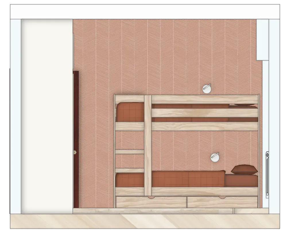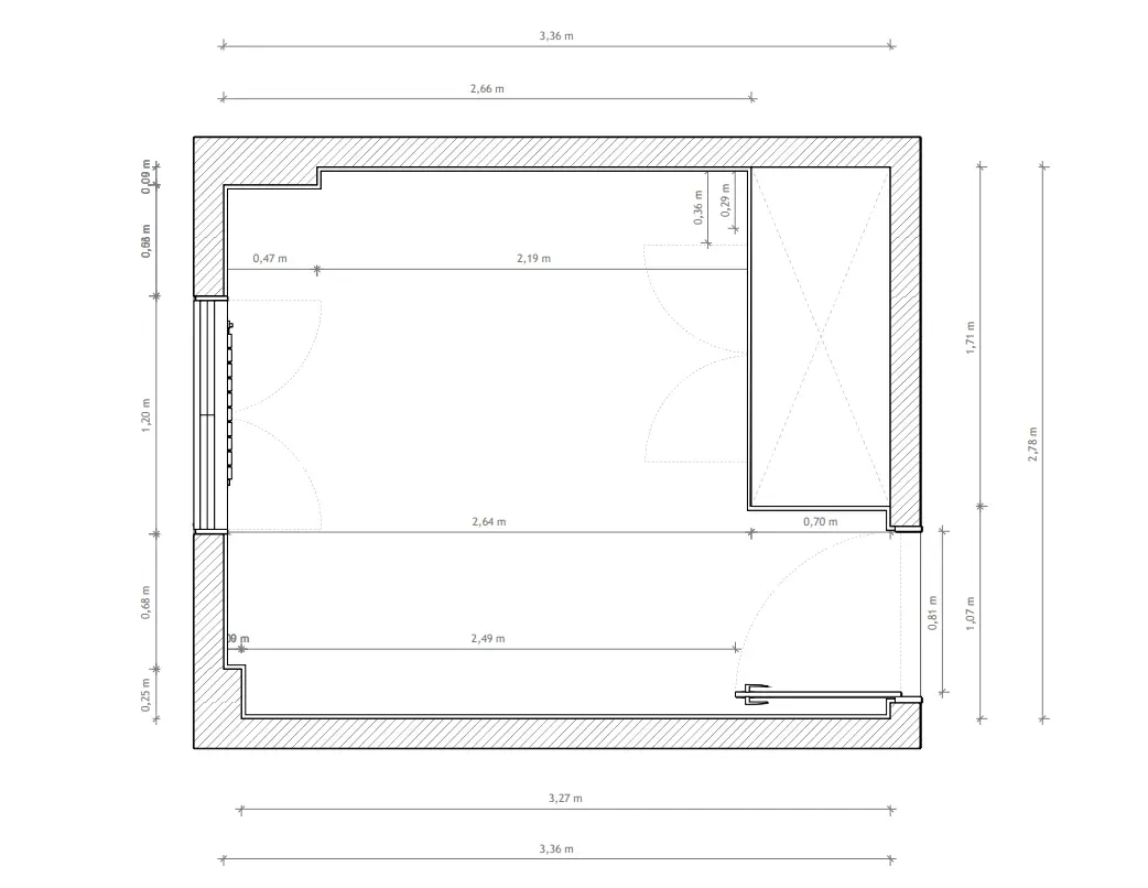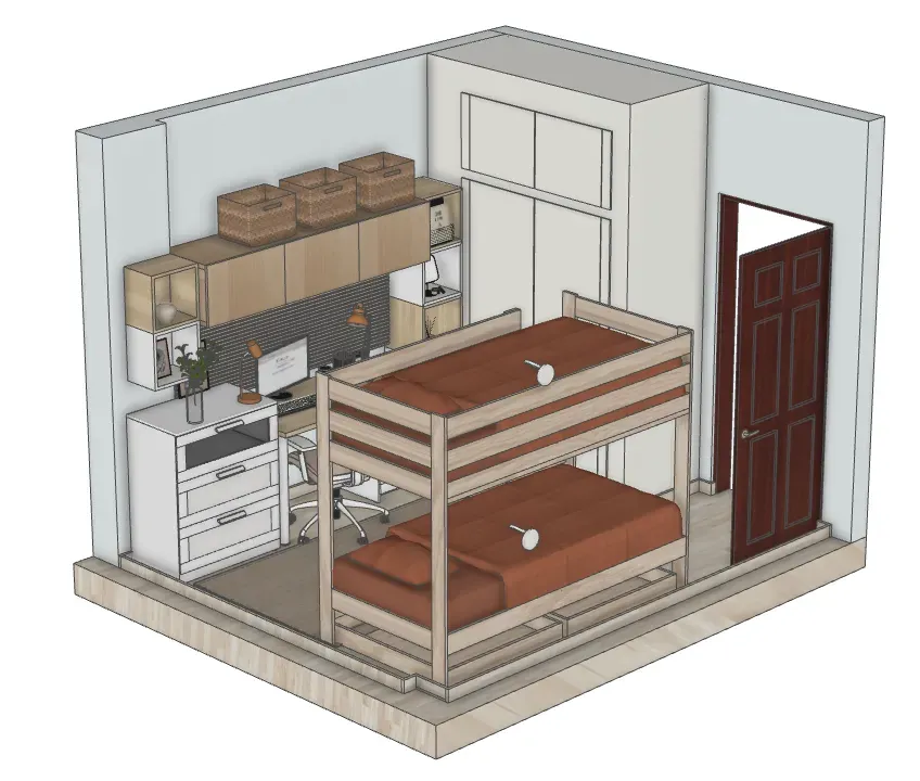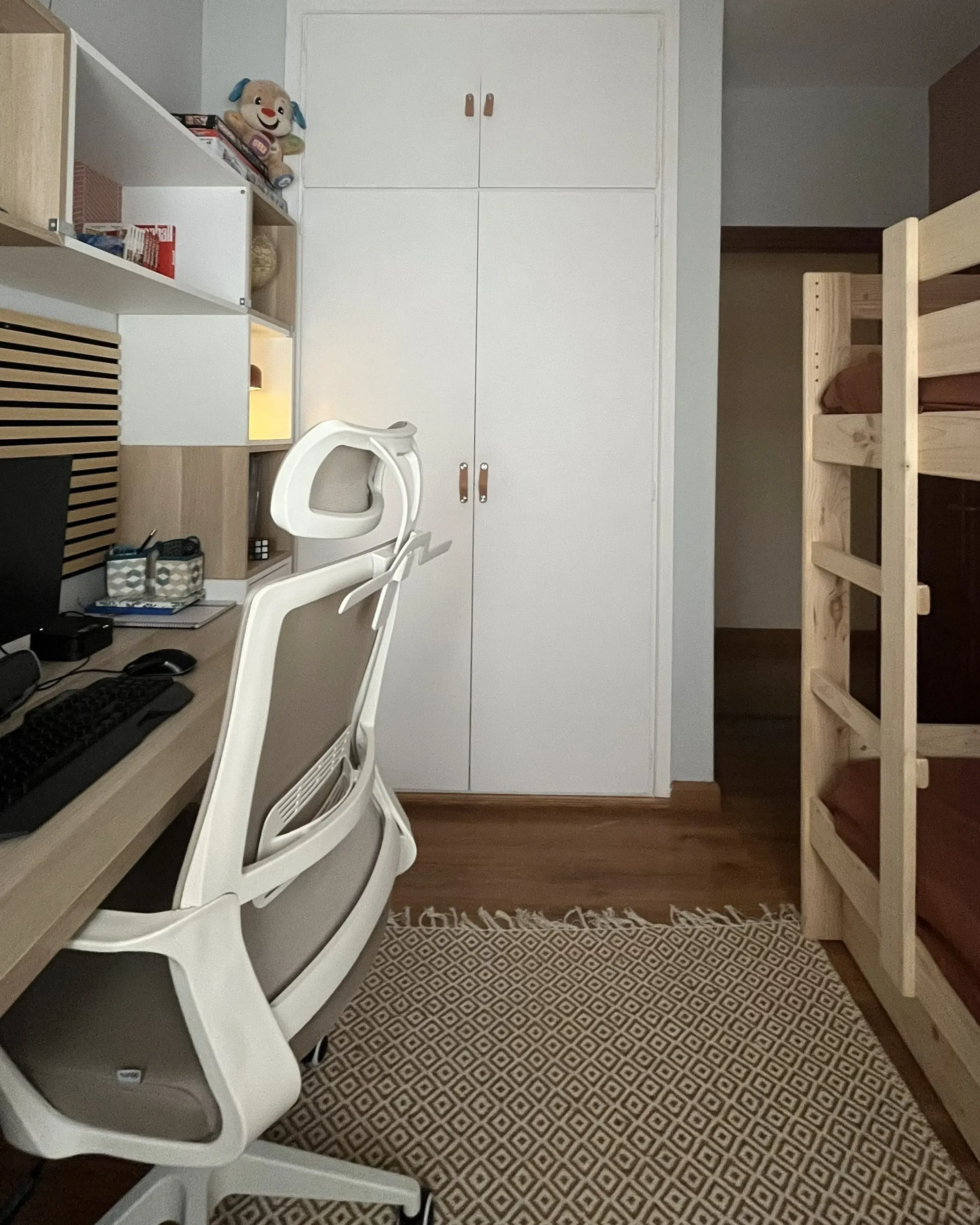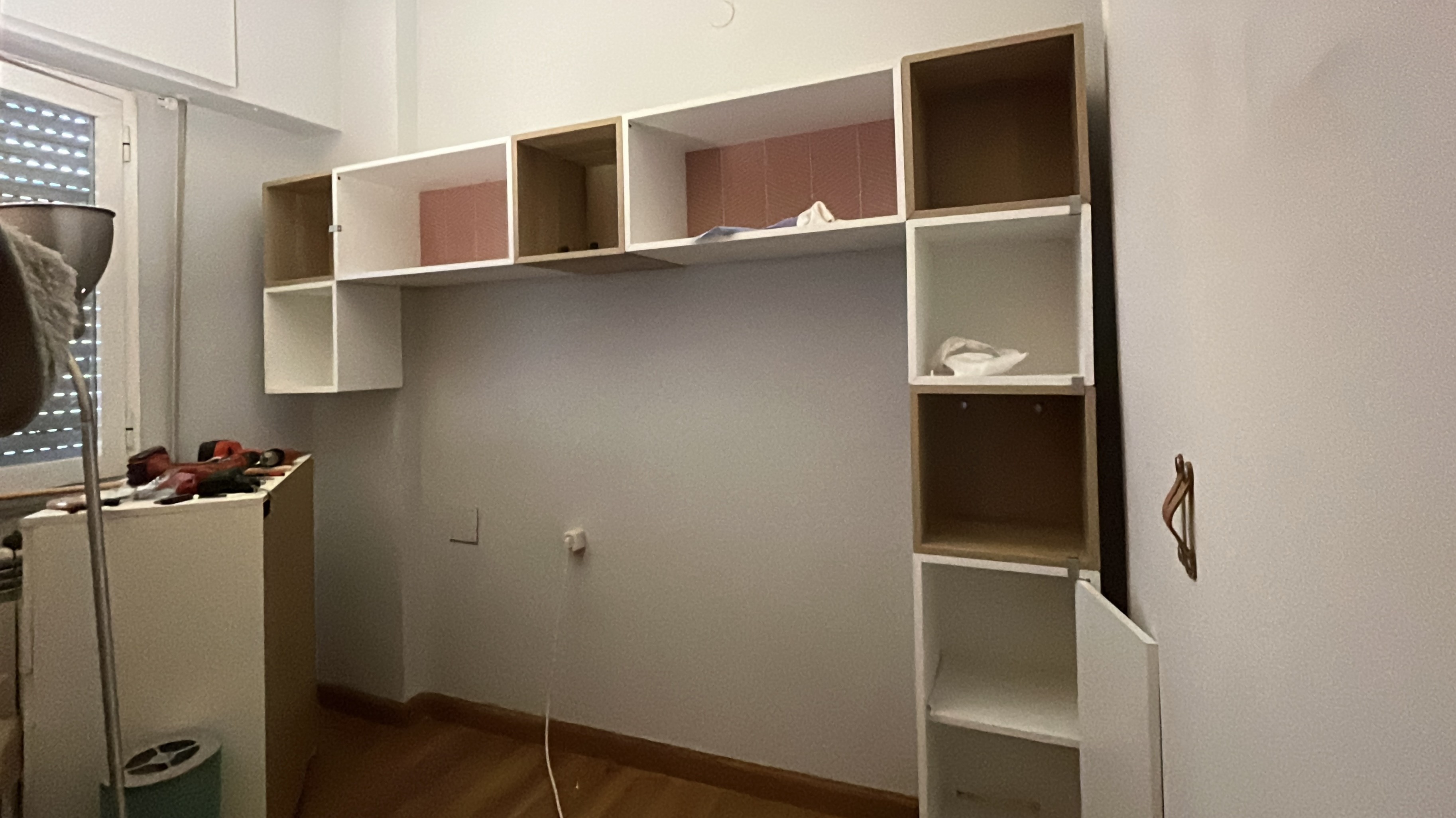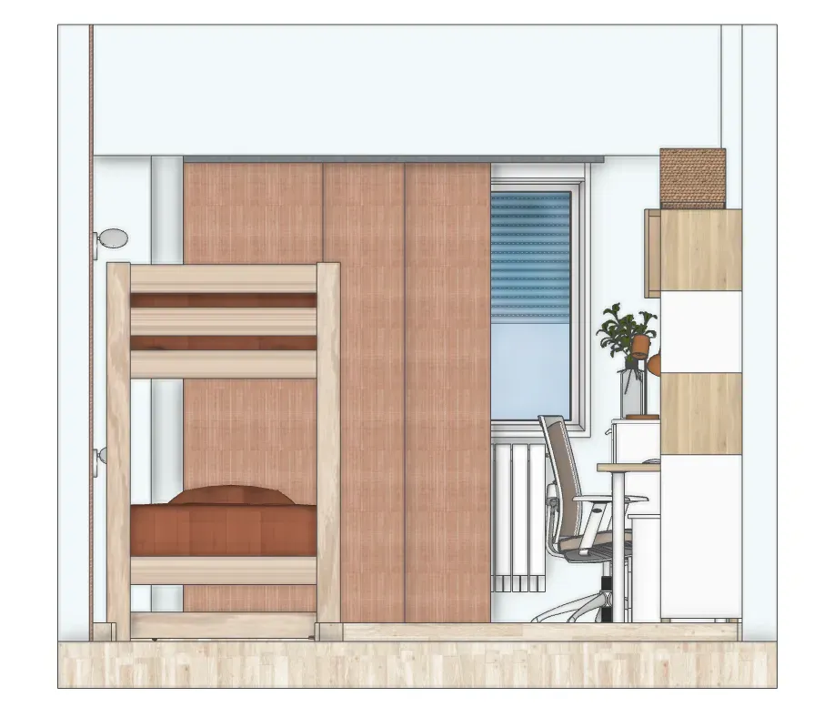 El espacio original planteaba una geometría ajustada y un programa exigente para su superficie: descanso, puesto de estudio funcional y capacidad real de almacenaje, con un uso intensivo y evolución en el tiempo.