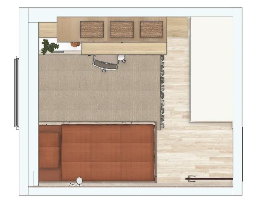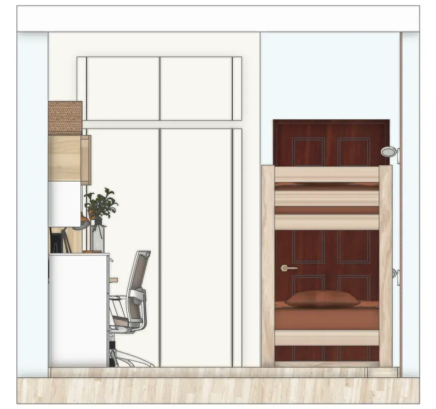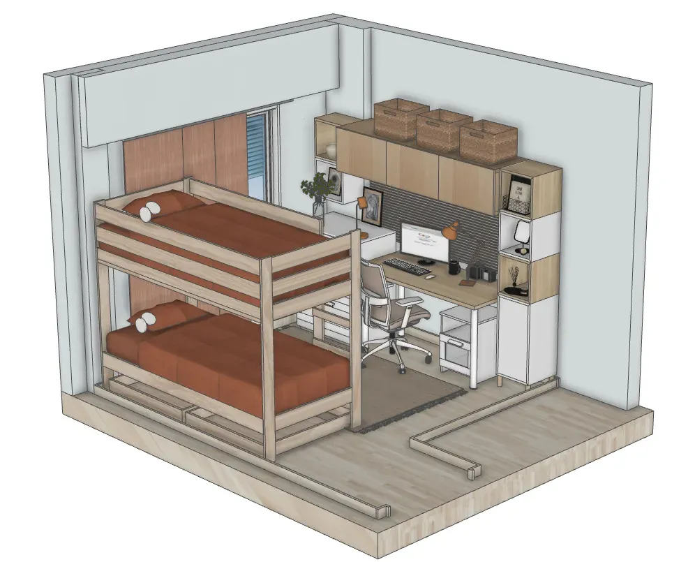 sistema continuo de mobiliario integrado que concentra descanso, estudio y almacenaje sin intervención de obra.