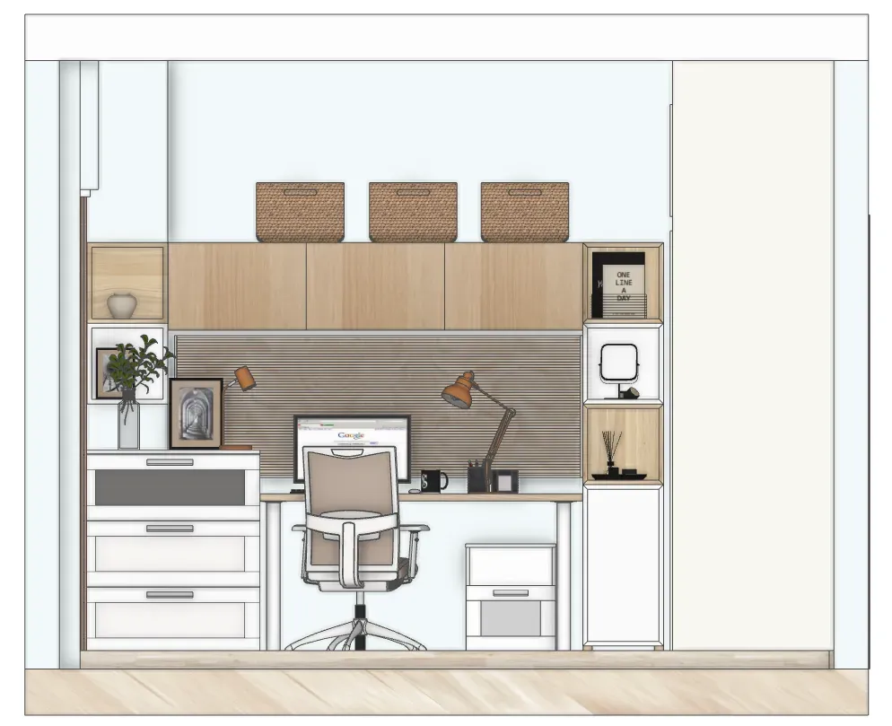 Se articula un frente único como sistema modular que integra trabajo, almacenaje y soporte lumínico, con criterio dimensional y control de alineaciones para garantizar viabilidad de ejecución y lectura limpia.